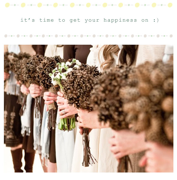 I love pine cones. I love what they represent: rejuvenation and a new beginning for a hopeful baby pine tree. The season of fall is in full effect and we've got pine cones dropping all around us. After seeing this beautiful pine cone wedding from Honey of a Thousand Flowers (seen above), I plan on collecting a few to make a centerpiece for our mantel!