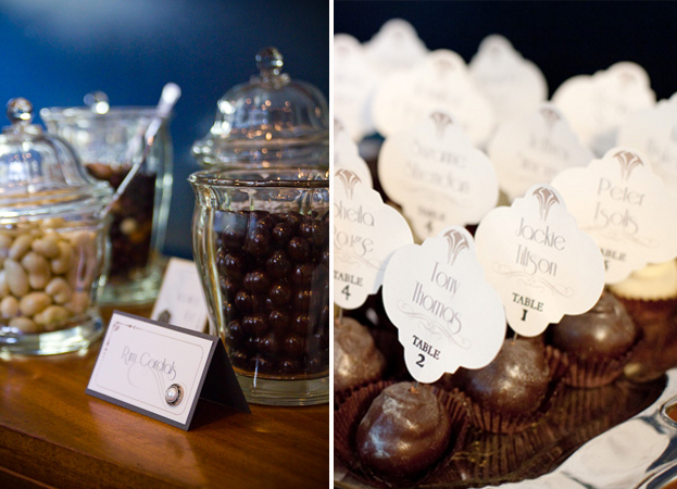 The theme was echoed perfectly by the stunning cake from Celestial Kitchens with architectural motifs. Eco-friendly paper goods and event ticket invitations provided by Spilled Ink Press added more drama with multiple textures and vintage buttons. The classy looking candies in cut-glass jars from Amy’s Candy Bar and eco-chic truffle escort cards handmade by Katherine Anne Confections really set the tone as guests began to arrive for the ceremony.