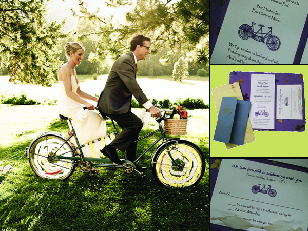 [photo credit: saskia m photography] Self-mailing bicycle-themed invitation, stitched with organic cotton thread, bow-tied with ivory Eco-twist.
