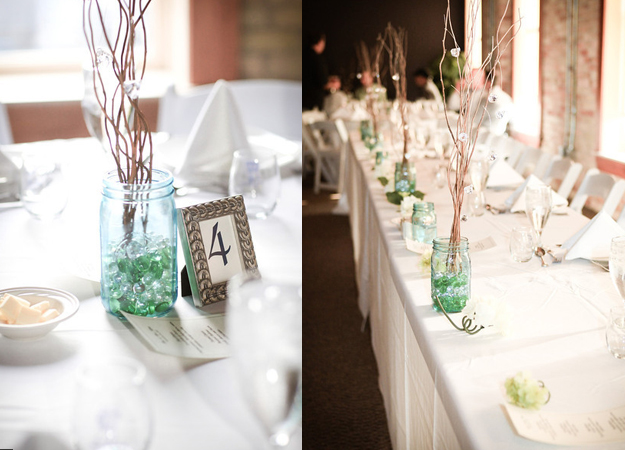 FROM MISTY: Donna and her sister worked very hard on all the DIY details of her weddings. They hand painted mason jars to give them a blue antique look. The small cups or wine glasses they bought online at Beau-Coup. They bought the rest of the details; pictures frames, little diamonds, silk flowers and tulle at Hobby Lobby and Michael’s, local craft stores. For the twigs and sticks used at ceremony and reception, Adam went out into the woods behind their house and chose branches, sanded them and sprayed with a clear coat to prevent flaking.